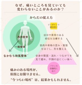 なかむら和氣整体では、痛いところやつらいところだけを部分的に見るのではなく、からだ全体のつながりやバランスを大切にしています。